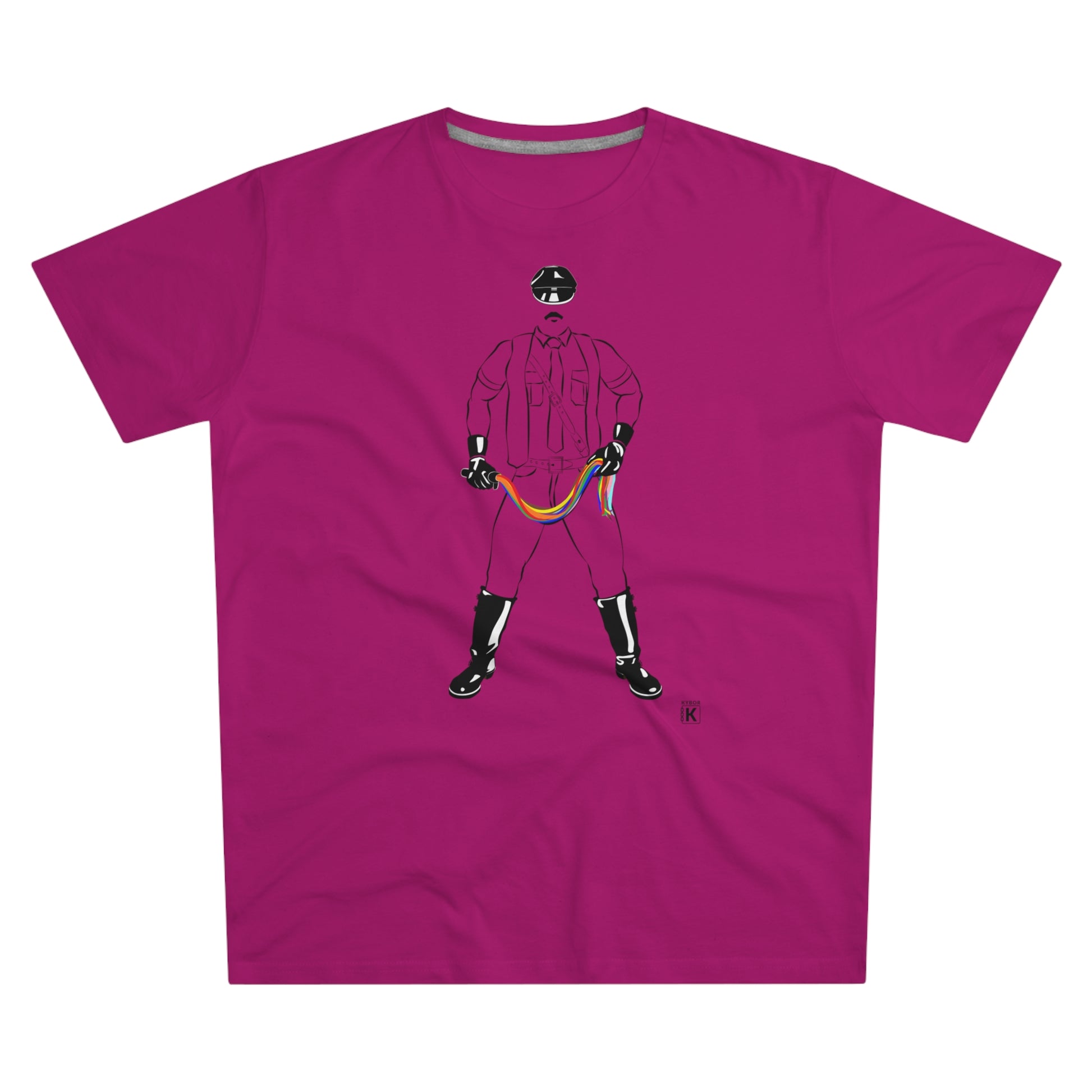 A bold graphic with this Tom of Finland inspired leatherman holding a rainbow pride whip - charged with colours to echo both power and play. Black ink printed on white / colour frabrics - on soft cotton with a regular fit for comfort.