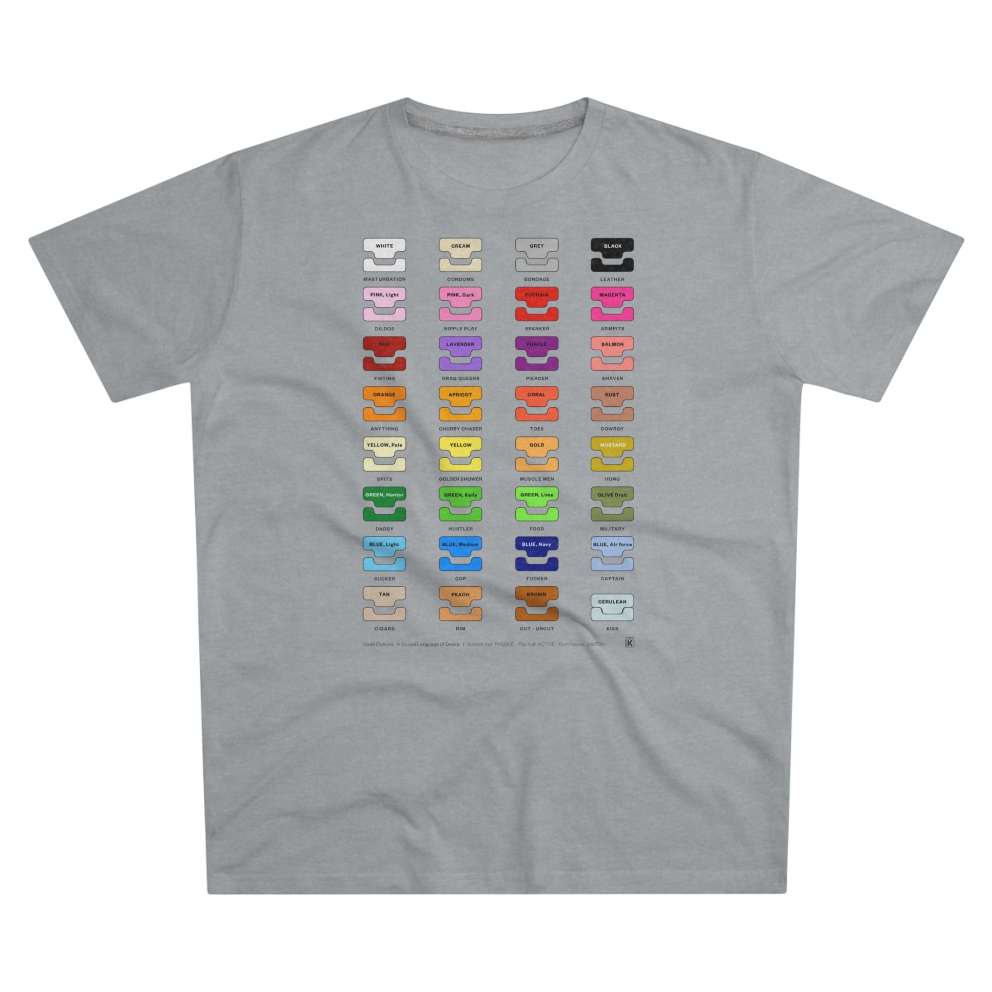 A striking T-shirt featuring 32 shades of expression, history, and connection. These Colour Codes are a vibrant map of identity, attraction, and desire. This statement piece celebrates gay history and visual language. A bold reminder that colour speaks, even when we don’t.